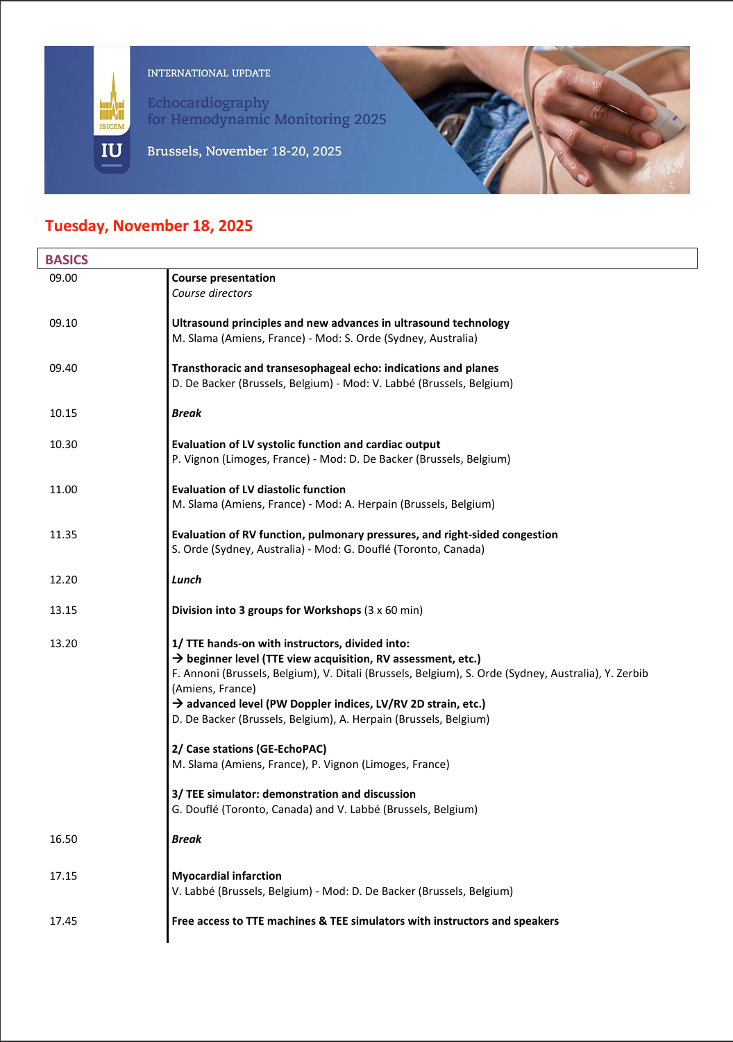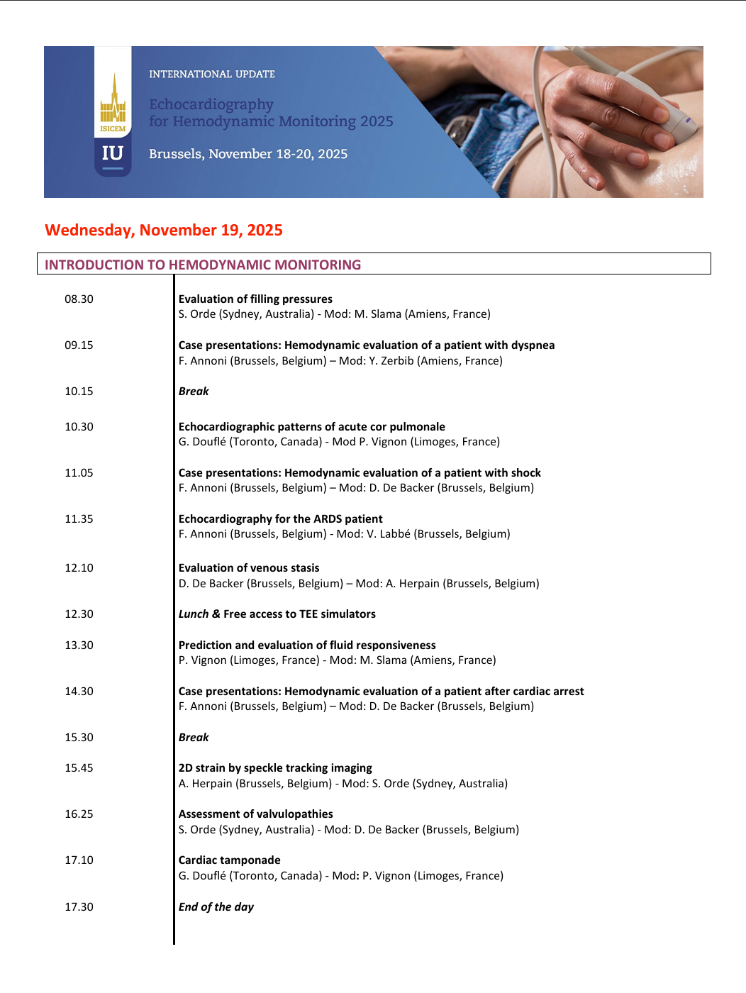 To promote the use of echocardiography in the hemodynamic evaluation of critically ill patients. The course will be interactive, with a lot of time devoted to questions, hands-on sessions, and discussions of live video-transmissions