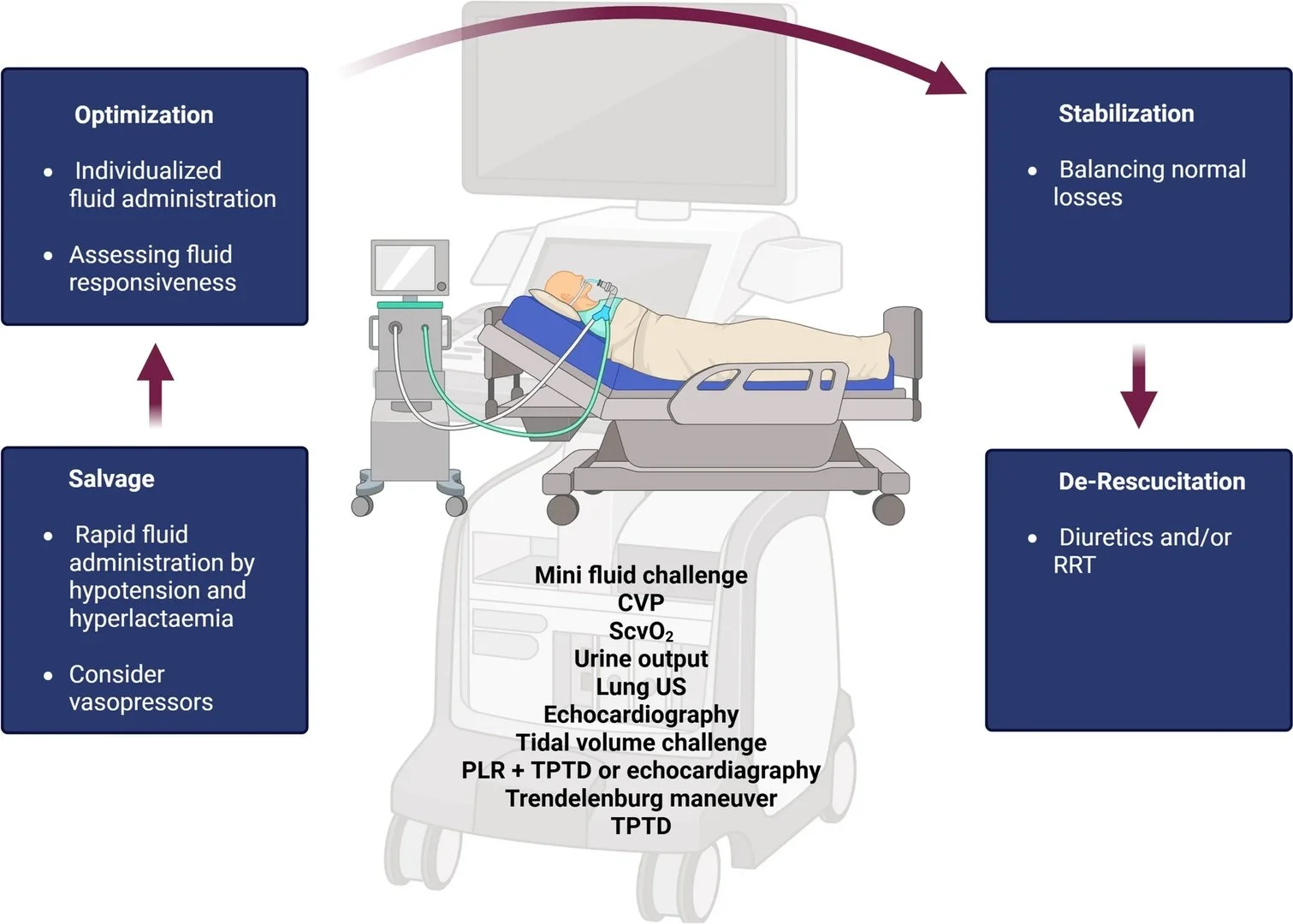Four phases of fluid resuscitation and available hemodynamic monitoring modalities in critically ill patients. CVP central venous pressure, PLR passive leg raising, RRT renal replacement therapy, ScvO2 central venous oxygen saturation, TPTD transpulmonary thermodilution, US ultrasound