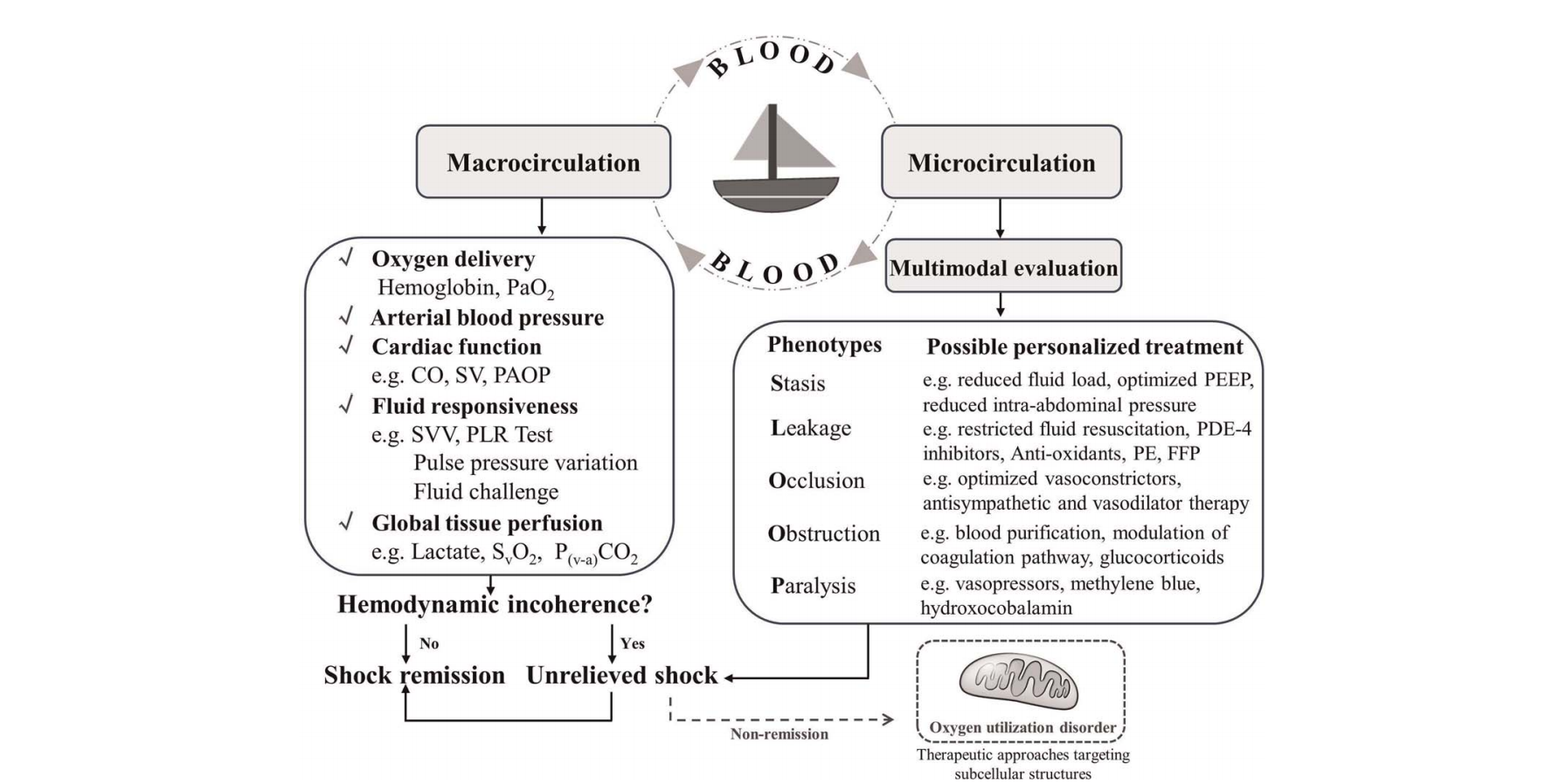 First, according to the monitoring parameters of the macrocirculation, the systemic hemodynamics were optimized to ensure that the patients had sufficient cardiac output and blood volume. Attention is needed to correct anemia and hypoxemia so that the macrocirculation provides adequate blood flow and oxygen to the microcirculation. If the patient’s shock does not improve, there is hemodynamic incoherence. At this time, the phenotype of hemodynamic incoherence can be determined by multimodal monitoring, and then personalized treatment means can be adopted to restore the coherence of macrocirculation and microcirculation. With the advancement of technology, monitoring and treatment methods for oxygen utilization impairment induced by subcellular structural injury may be popularized in the future.